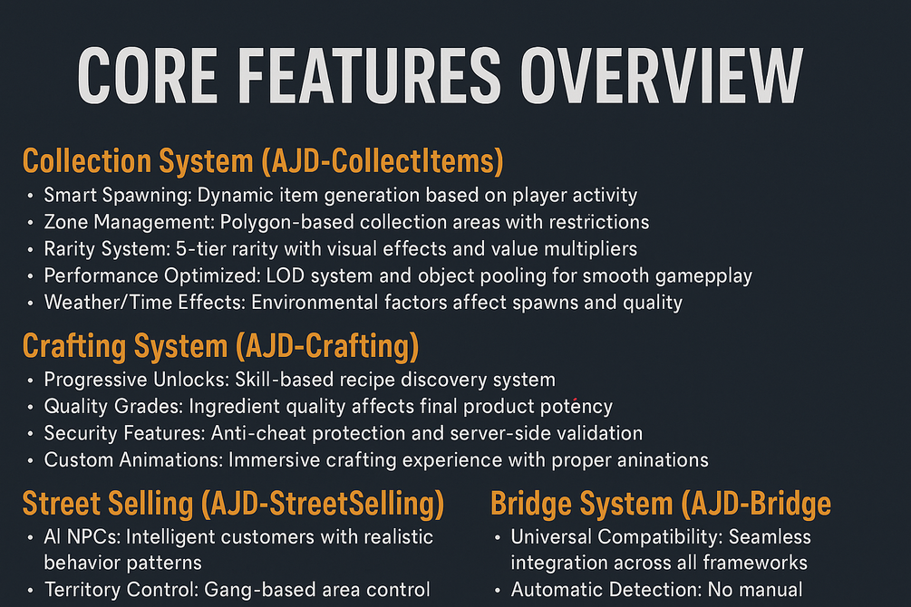 AJD-Drugs is a complete FiveM drug script framework built for QB-Core and ESX. It connects crafting, street selling, and economy systems into one seamless package.
